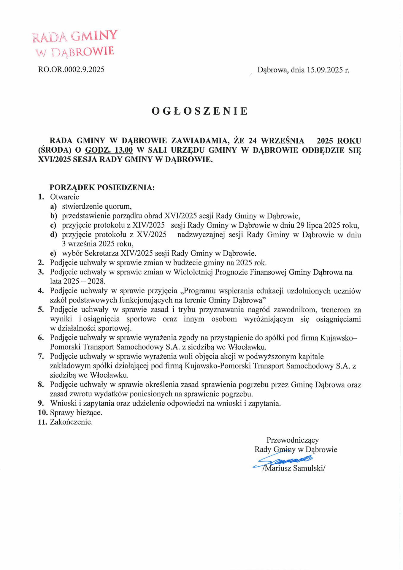 Ogłoszenie o XVI/2025 sesji Rady Gminy w Dąbrowie w dniu 24 września 2025 roku.