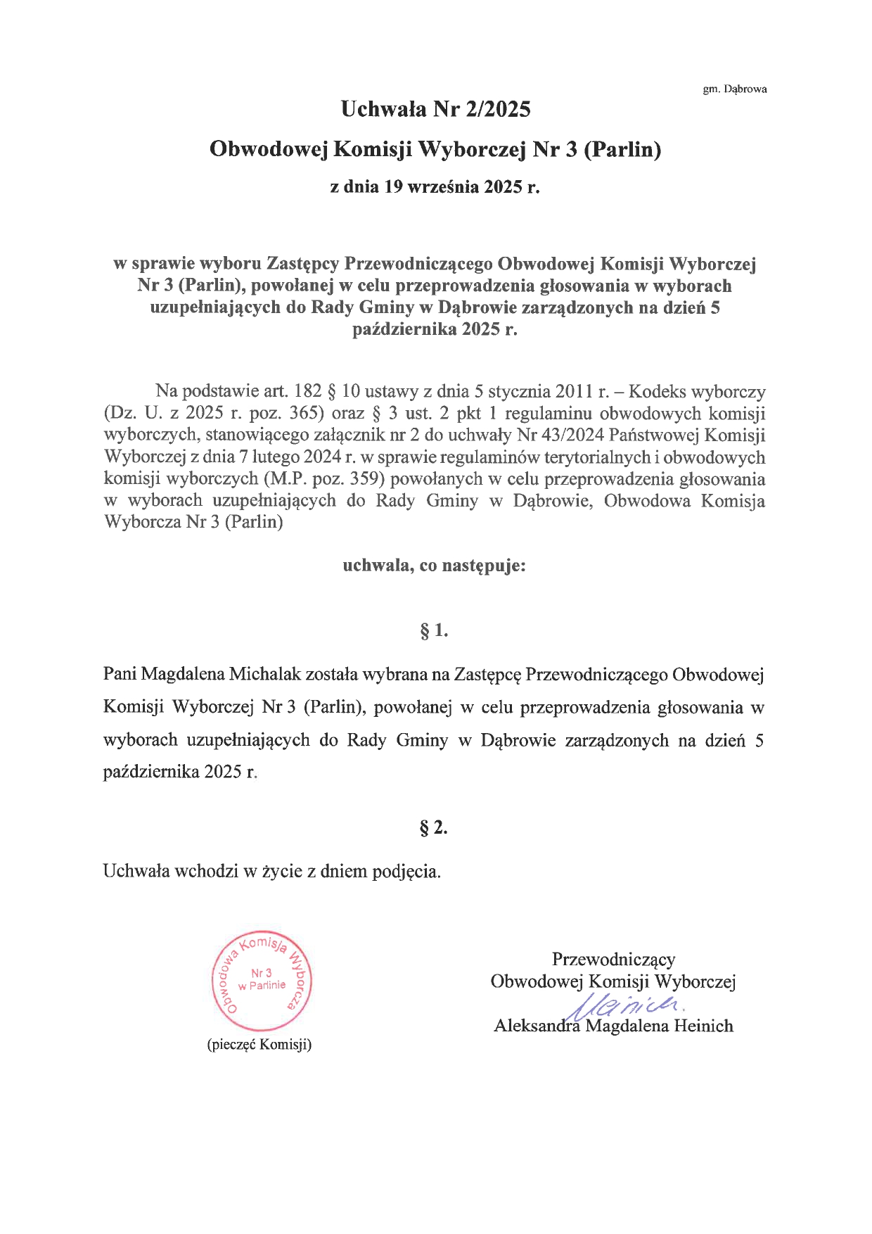 Uchwały Obwodowej Komisji Wyborczej Nr 3 ( Parlin) w sprawie wyboru Przewodniczącego i Zastepcy Przewodniczącego Obwodowej Komisji Wyborczej Nr 3 ( Parlin) powołanej w celu przeprowadzenia głosowania w wyborach uzupełniających do Rady Gminy w Dąbrowie zarządzonych na dzień 5 października 2025 roku