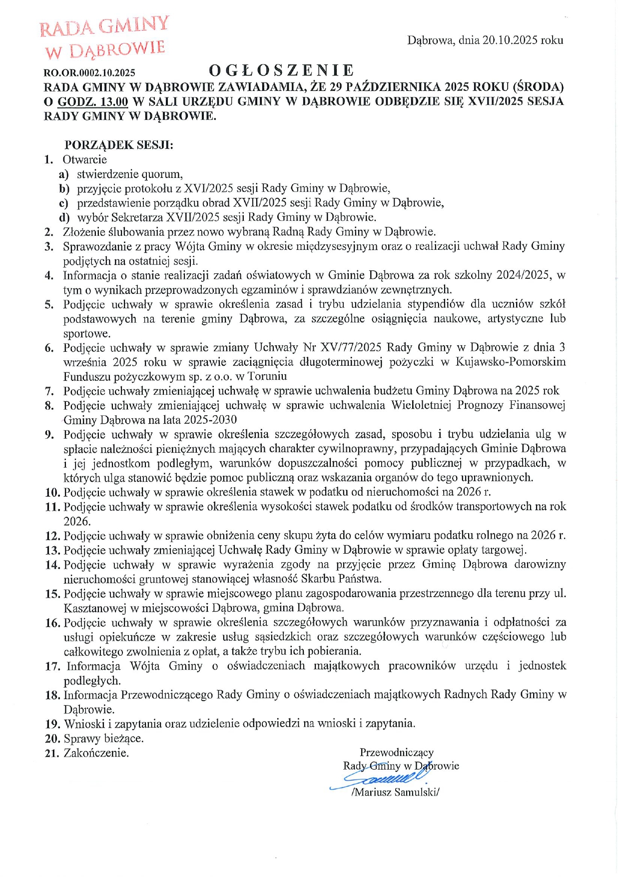 Ogłoszenie o XVII/2025 sesji Rady Gminy w Dąbrowie w dniu 29 października 2025 roku.